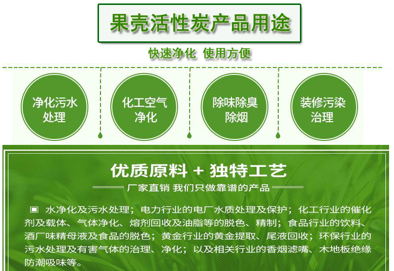 干燥劑領(lǐng)域:產(chǎn)品選用優(yōu)質(zhì)椰殼、果殼為原料,經(jīng)過(guò)高溫活化及特殊孔徑調(diào)節(jié)工藝處理,使其具備了廣大無(wú)比的比表面積及豐富的中、微孔結(jié)構(gòu),能有效祛除各種包裝產(chǎn)品內(nèi)的異味、臭味和水份。對(duì)于包裝、倉(cāng)儲(chǔ)、運(yùn)輸?shù)冗^(guò)程防潮除臭效果明顯,除了擁有普通干燥劑吸水性強(qiáng)的特點(diǎn)外,還具備了除臭除異味能力,這是它的雙重性,也是其他像硅膠、石灰粉等干燥劑所無(wú)法做到的;钚蕴扛稍飫⿷(yīng)用廣泛:主要用于食品、服裝、茶葉、醫(yī)療、皮革、機(jī)械、電子、電器、精密儀器等領(lǐng)域,吸水、干燥、防潮、除臭。